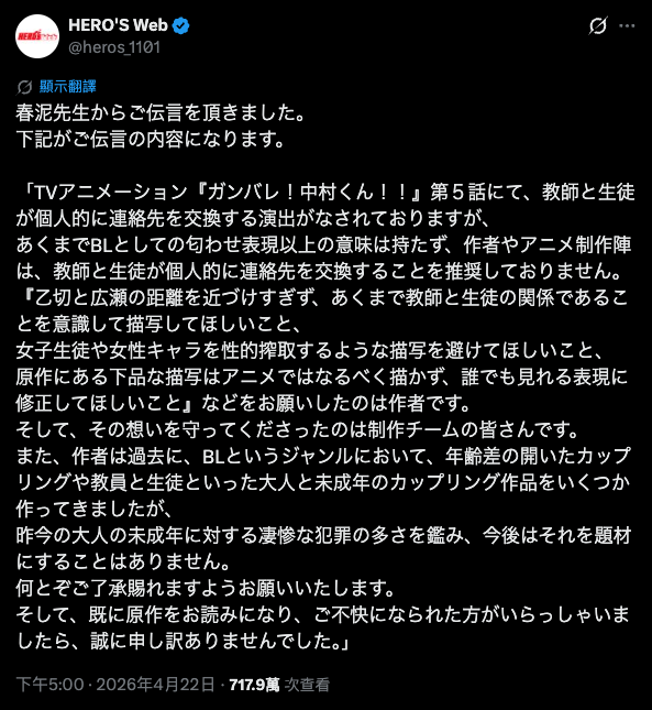 日本 BL 漫畫作品《加油!中村同學!!》原作者春泥日前因被海外網民懷疑支持師生戀而遭到言語騷擾,於 4 月 12 日刪除了自己的 X 帳號,至今仍未回歸。