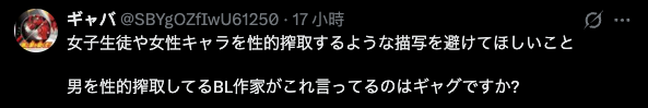 然而這篇卻在日本社群開啟了另一個戰場。部分網民批評:「一個平常在創作對男性性剝削的 BL 漫畫家,說『請避免描寫任何對女性角色構成性剝削的行為』,這是什麼雙標笑話嗎?」、「典型的 BL 無罪論,真可笑。」